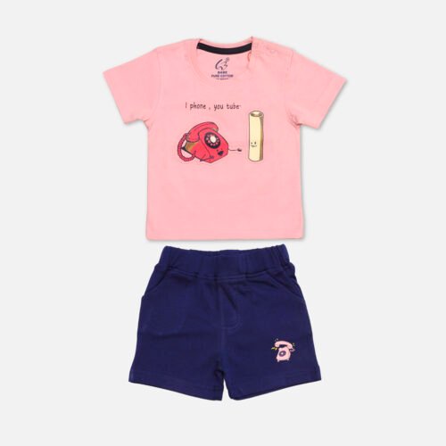 Kids Set Printed Crew Neck Snap-button(Pink)